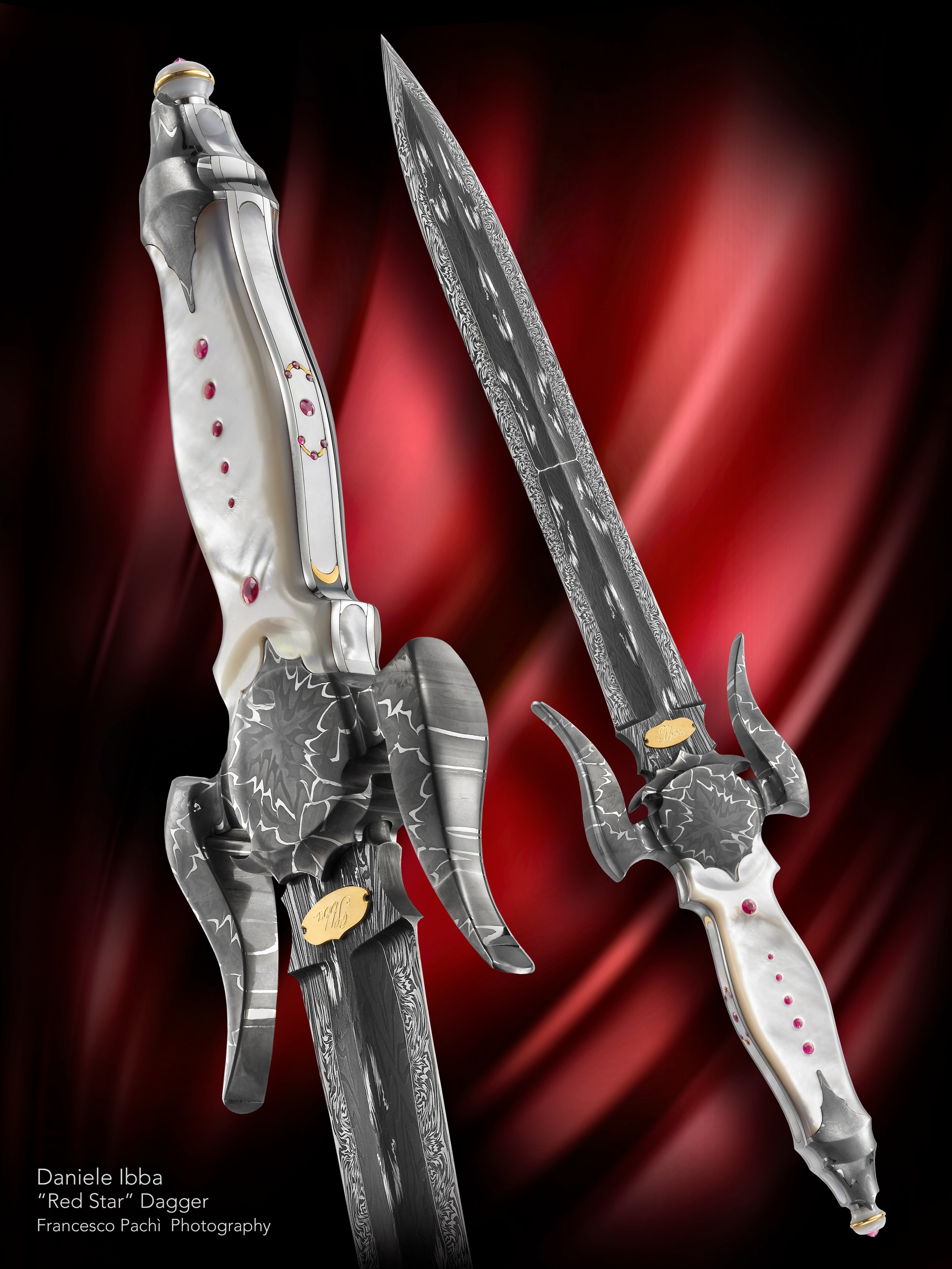 “Red Star Art Dagger” – The blade, the integral guard and bolsters are realized from mosaic damascus forged by Vlad Matveev, white mother of pearl handle scales and backspacers with 24kt gold inlays, back pommel made from mother pearl, 24kt gold and one ruby by 0,30ct. Other 12 Rubies on the handle scales and 14 rubies on the backpsacer have been setting to complete this timeless piece – Total Length 37,00cm