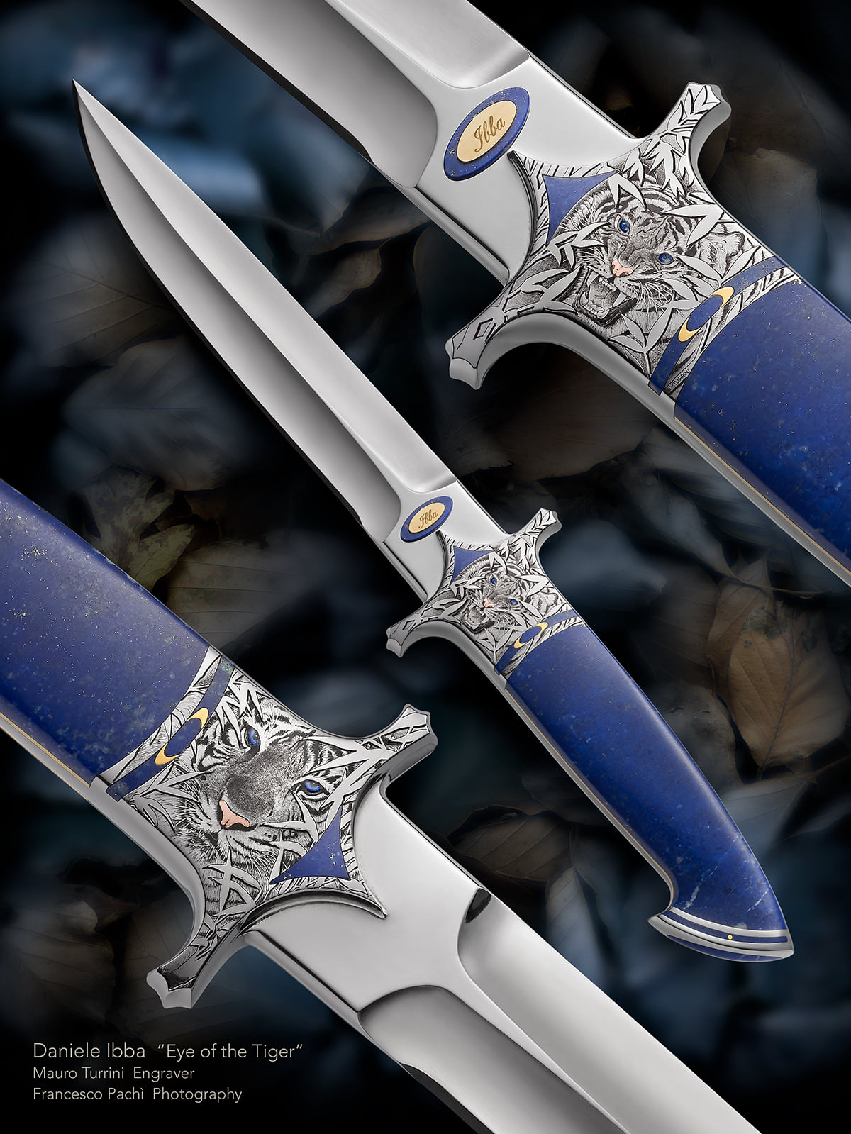 Integral fixed blade made from a single piece of stainless steel, natural afghan lapis handle scales and 15 inlays between 24kt gold and stones. Beautifully engraved with Tiger theme by Mauro Turrini