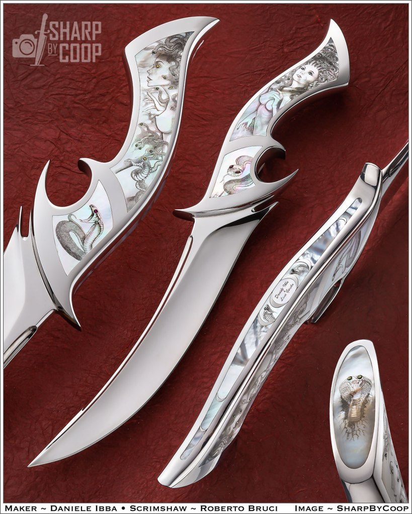 It’s a integral knife, made from a single piece of 440c stainless steel, on the handle have been added 13 inalys made from white mother pearl, and in the eyes of the Medusa and snakes have been added rubies, blue, green and yellow diamonds. The engraving with scrimshaw technique was done by Roberto Bruci